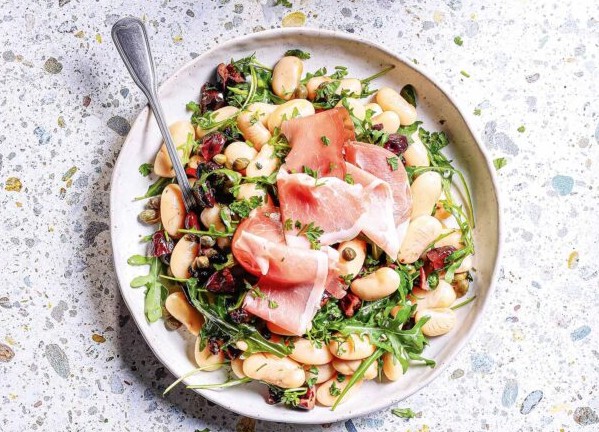 Μπορούμε να σερβίρουμε αυτή την πρωτότυπη, γλυκόξινη οσπριοσαλάτα με διάφορους τρόπους: με προσούτο, (όπως στη φωτό), με τυρί μελίχλωρο σαγανάκι, με τραγανοψημένο λουκάνικο τσορίθο, με μπέικον σε κυβάκια, τηγανισμένα χωρίς λιπαρή ουσία μέχρι να γίνουν τραγανά, με φέτα θρυμματισμένη ή, τέλος, με καπνιστό σκουμπρί ή φιλέτο ρέγκας.