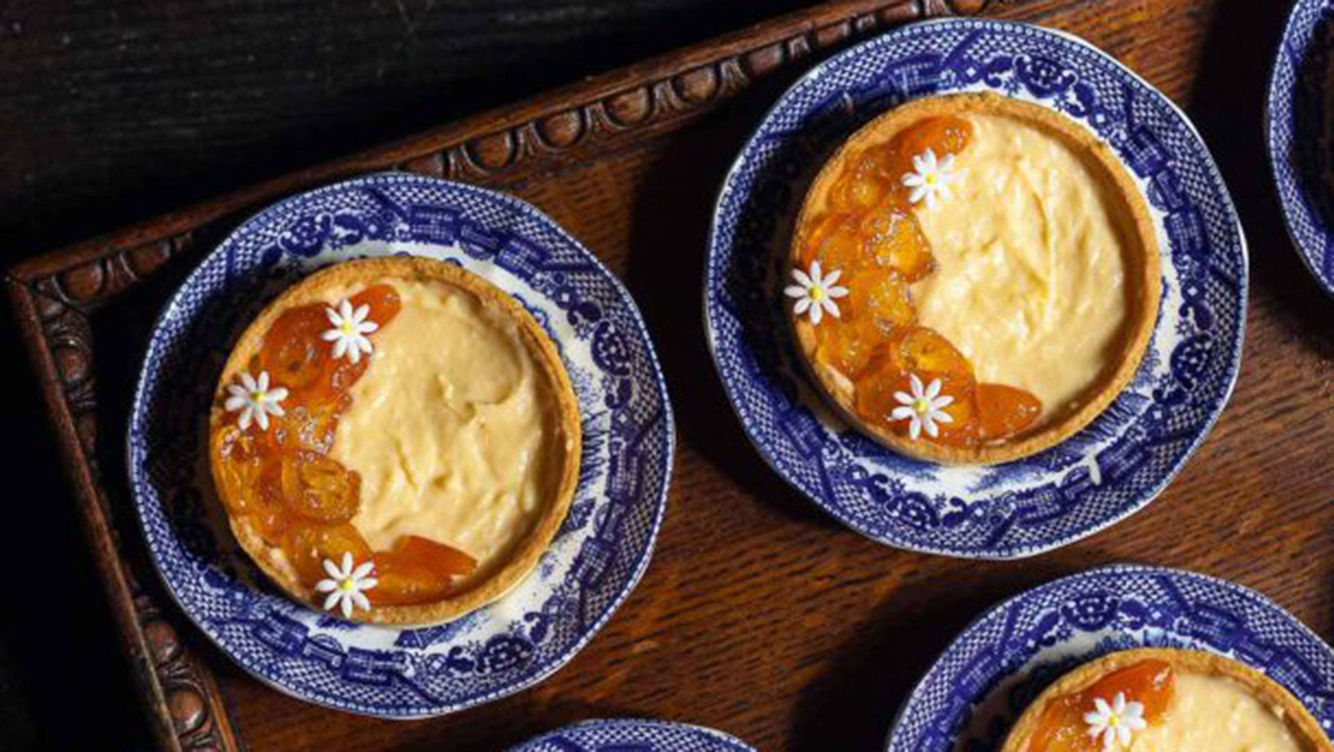 - Διακοσμούμε με τα φετάκια από τα ζαχαρωμένα κουμκουάτ και σερβίρουμε.