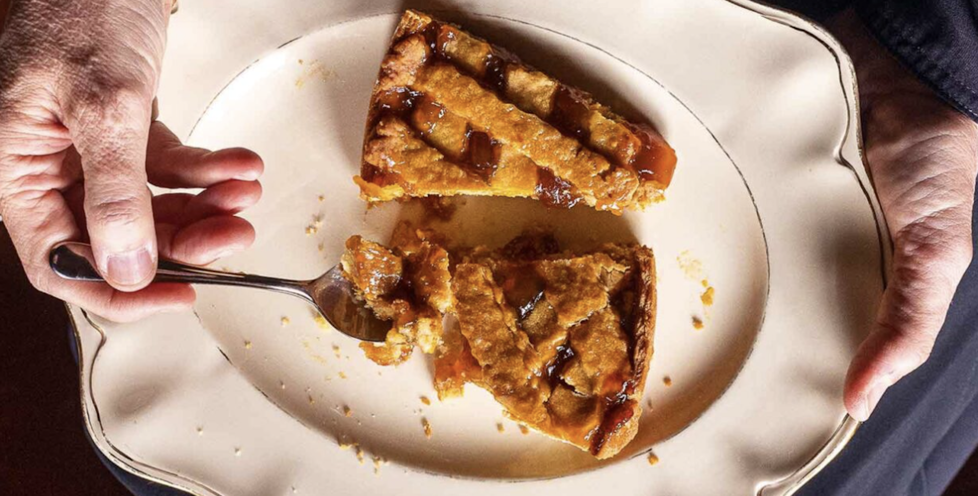 - Χωρίζουμε σε μπαλίτσες το δεύτερο κομμάτι ζύμης και τις πλάθουμε σε κορδόνια, τα οποία στρώνουμε χιαστί σαν δίχτυ πάνω στη μαρμελάδα (στο χαρακτηριστικό σχέδιο της πάστα φλόρα), κολλώντας τις άκρες κάθε κορδονιού στη ζύμη στην περιφέρεια της τάρτας.