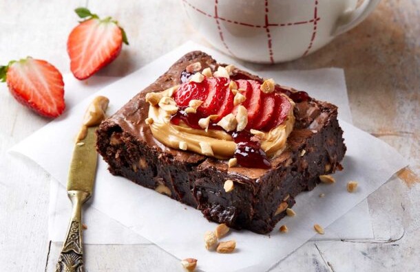 - Από πάνω απλώνουμε τη μαρμελάδα φράουλα και στολίζουμε με τις κομμένες φράουλες. Ανάμεσά τους σκορπίζουμε τα πίνατς. Κόβουμε σε τετράγωνα κομμάτια και σερβίρουμε το μπράουνι.