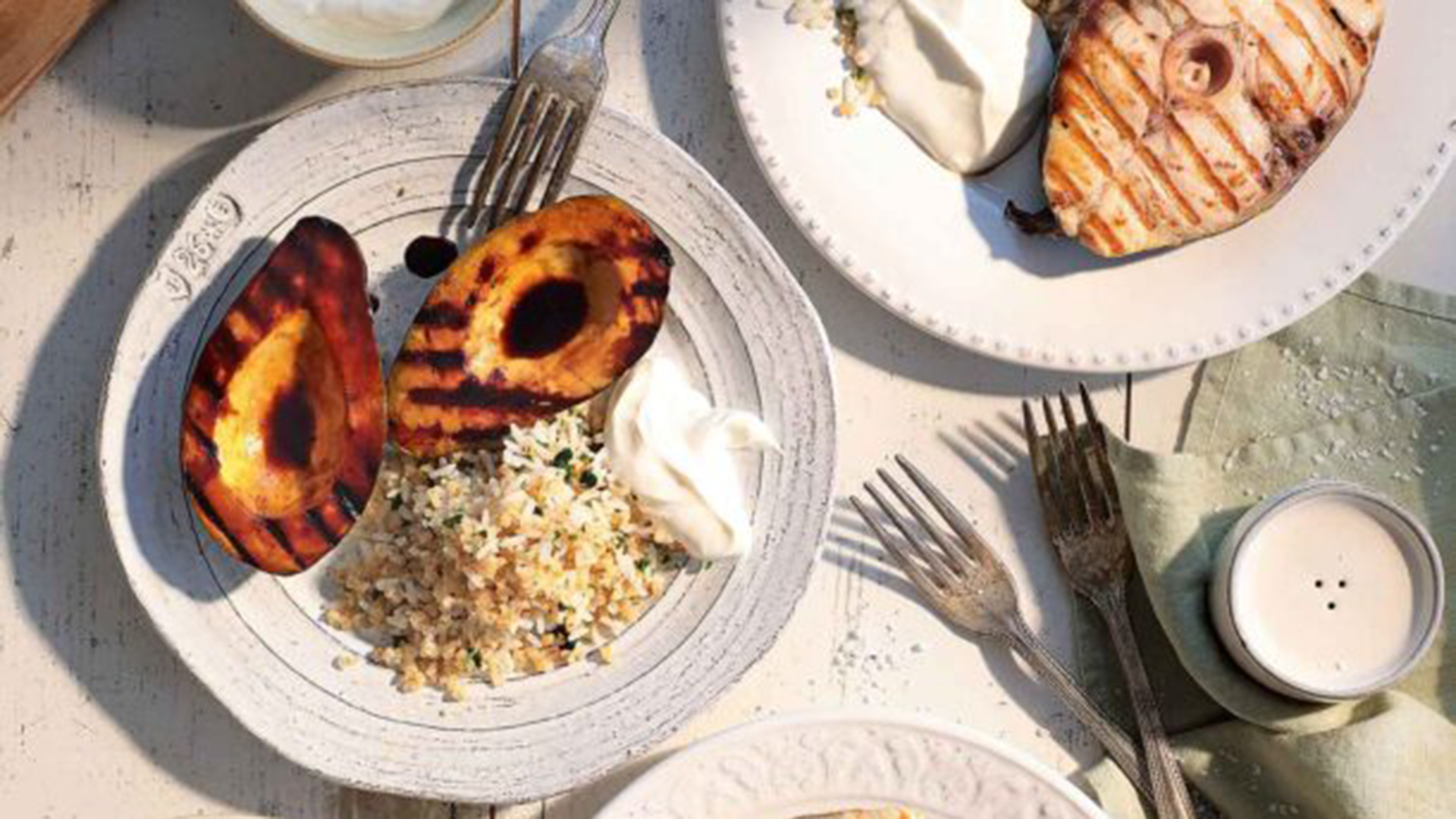 - Αλείφουμε τα αβοκάντο με τη μισή σάλτσα και τα τοποθετούμε στη σχάρα με την κομμένη πλευρά προς τα κάτω.