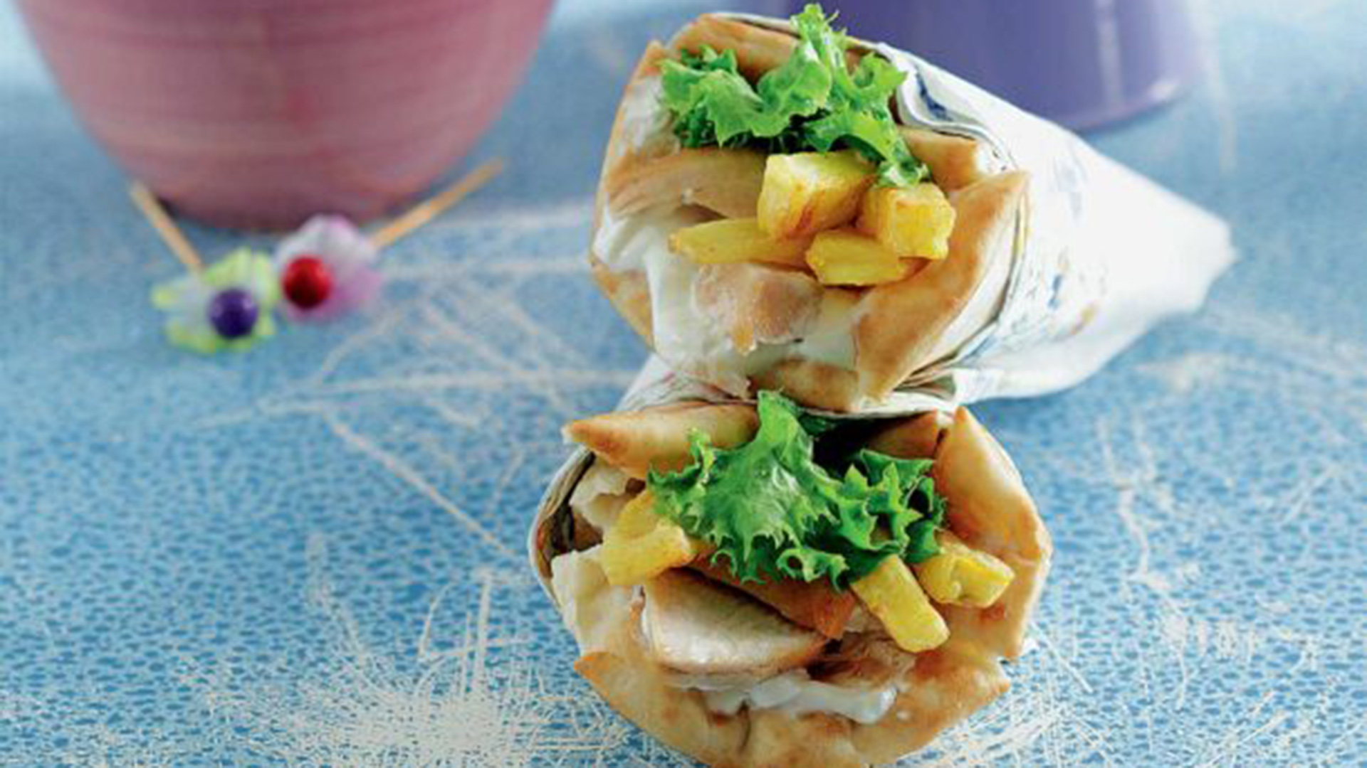 - Κόβουμε το στήθος κοτόπουλου σε λεπτές λωρίδες και γεμίζουμε το κάθε κομμάτι πίτας με κοτόπουλο, μαρούλι και λίγες πατάτες.