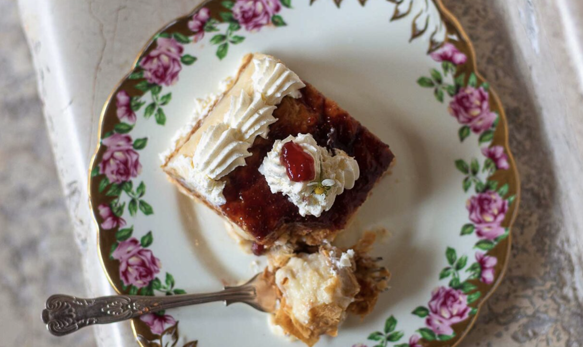 - Σε μια μεγάλη πιατέλα, κατά προτίμηση τετράγωνη, ακουμπάμε το ένα τετράγωνο φύλλο σφολιάτας και στρώνουμε πάνω του τη μισή κρέμα. Επάνω της ακουμπάμε τα δύο παραλληλόγραμμα κομμάτια σφολιάτας, ενωμένα, ώστε να σχηματιστεί ξανά ένα τετράγωνο. Επάνω του απλώνουμε την υπόλοιπη κρέμα και καλύπτουμε με το δεύτερο τετράγωνο κομμάτι σφολιάτας. Το αλείφουμε προσεκτικά με τη μαρμελάδα, σε επίσης γενναία στρώση.