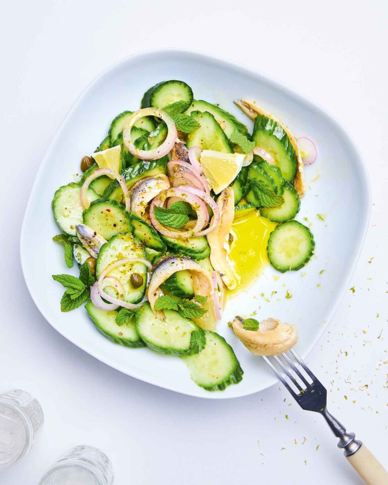 - Για την αγγουροσαλάτα με αντζούγιες, κάππαρη, λάιμ και δυόσμο, σε μια ευρύχωρη σαλατιέρα ανακατεύουμε καλά όλα τα υλικά και σερβίρουμε.