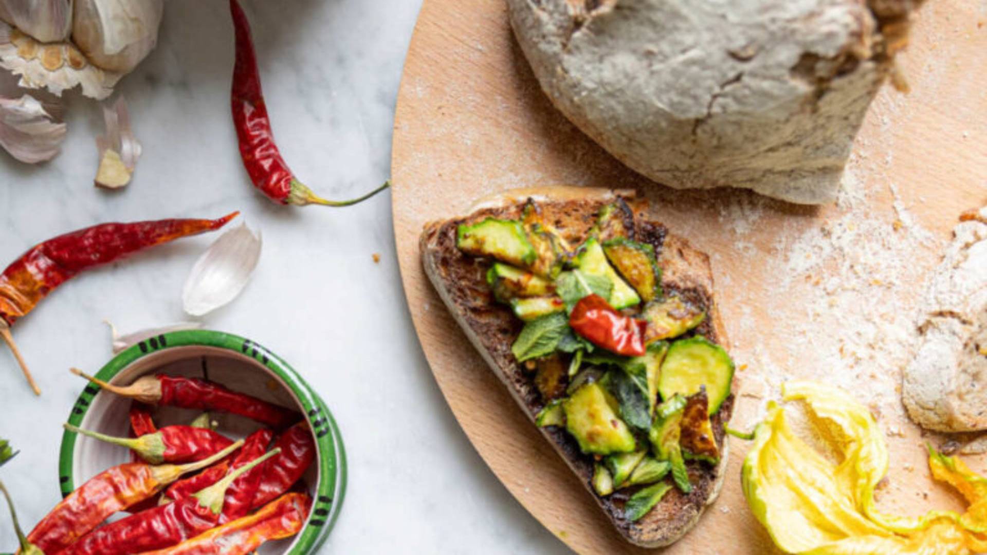 Κολοκυθάκια, πεπεροντσίνο και δυόσμος ροδίζουν στο τηγάνι και ύστερα ξαπλώνουν στην μπρουσκέτα. Ο,τι πιο εύκολο, γρήγορο και νόστιμο.