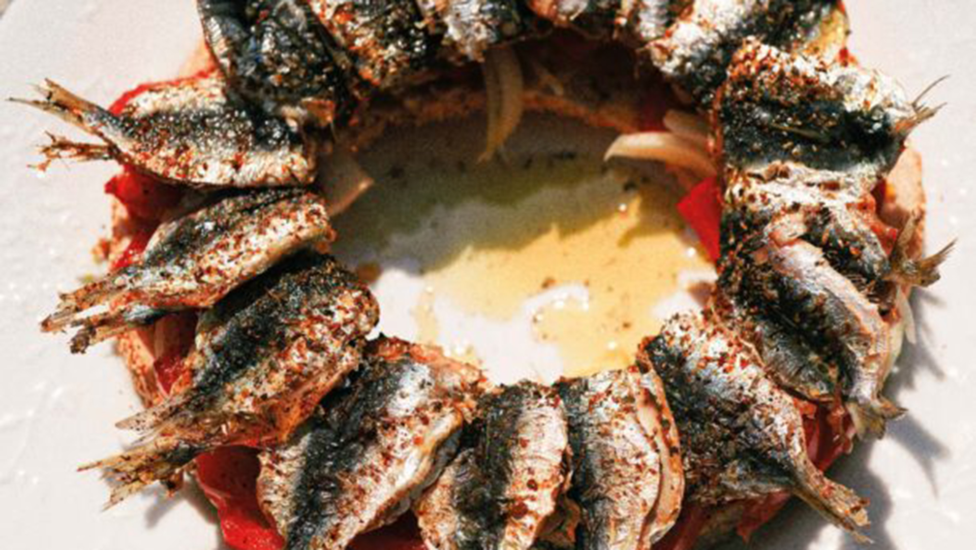 - Τακτοποιούμε πάνω του, ακτινωτά, τα ψημένα «σάντουιτς» σαρδέλας, τις φέτες ντομάτας και τις ροδέλες κρεμμυδιού.