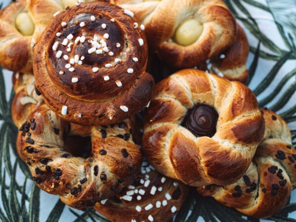 Παραλλαγές Χωρίζουμε το φουσκωμένο ζυμάρι των 2 κιλών σε 4 ίσα μέρη. Φτιάχνουμε τα δύο με τη βασική συνταγή και με τα άλλα δύο φτιάχνουμε ισάριθμες παραλλαγές: Με σταφίδες, κανέλα και κονιάκ: Ζυμώνουμε 1 κομμάτι ζύμης (500 γρ.) με 80 γρ. ανάμεικτες μαύρες και ξανθές σταφίδες, ελάχιστη κανέλα, ξύσμα από 1/2 πορτοκάλι και 80 ml κονιάκ μέχρι να αναμειχθούν καλά τα υλικά. Πλάθουμε το ζυμάρι σε χοντρό κορδόνι και το αφήνουμε να ξεκουραστεί για 30 λεπτά. Το κόβουμε στα τρία και πλάθουμε το καθένα ξανά σε κορδόνι. Πιάνουμε το κάθε κορδόνι από τις δύο του άκρες και τις στρίβουμε αντίστροφα, για να φτιάξουμε στριφτάρια. Ενώνουμε τις δύο άκρες από κάθε στριφτάρι για να γίνουν κουλούρι, τα αραδιάζουμε σε ταψί στρωμένο με λαδόκολλα και τα αφήνουμε στην άκρη για 30 λεπτά, σκεπασμένα με πετσέτα, μέχρι να φουσκώσουν. Τα αλείφουμε με χτυπημένο κρόκο, πασπαλίζουμε με χοντρή ζάχαρη διακόσμησης και τα ψήνουμε σε φούρνο προθερμασμένο στους 150°C, στη λειτουργία του αέρα, για 25-30 λεπτά. Με σοκολάτα: Ζυμώνουμε το τρίτο κομμάτι ζύμης (500 γρ.) με 50 γρ. σταγόνες κουβερτούρας, παγωμένες, από την κατάψυξη, μέχρι να σκορπίσουν ομοιόμορφα στο ζυμάρι. Πλάθουμε το ζυμάρι σε χοντρό κορδόνι και το αφήνουμε να ξεκουραστεί για 30 λεπτά. Το κόβουμε στα τρία και πλάθουμε το καθένα ξανά σε κορδόνι. Πιάνουμε το καθένα από μία άκρη και στρίβουμε αντίστροφα, για να φτιάξουμε τρία στριφτάρια. Ενώνουμε τις δύο άκρες του καθενός για να γίνουν κουλούρι, τα αραδιάζουμε σε ταψί στρωμένο με λαδόκολλα και τα αφήνουμε στην άκρη για 30 λεπτά, σκεπασμένα με πετσέτα, μέχρι να φουσκώσουν. Τα αλείφουμε με χτυπημένο κρόκο και τα ψήνουμε σε φούρνο προθερμασμένο στους 150°C, στη λειτουργία του αέρα, για 25-30 λεπτά.