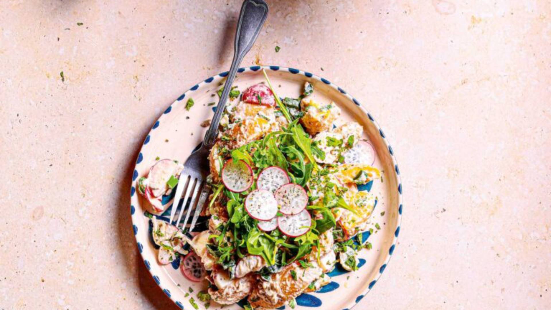 Για αυτή τη διαφορετική πατατοσαλάτα χτυπάμε τον τόνο στον πολυκόφτη και φτιάχνουμε μια λεία και αφράτη κρέμα, σαν αραιή μαγιονέζα, με την οποία περιχύνουμε τα λαχανικά.