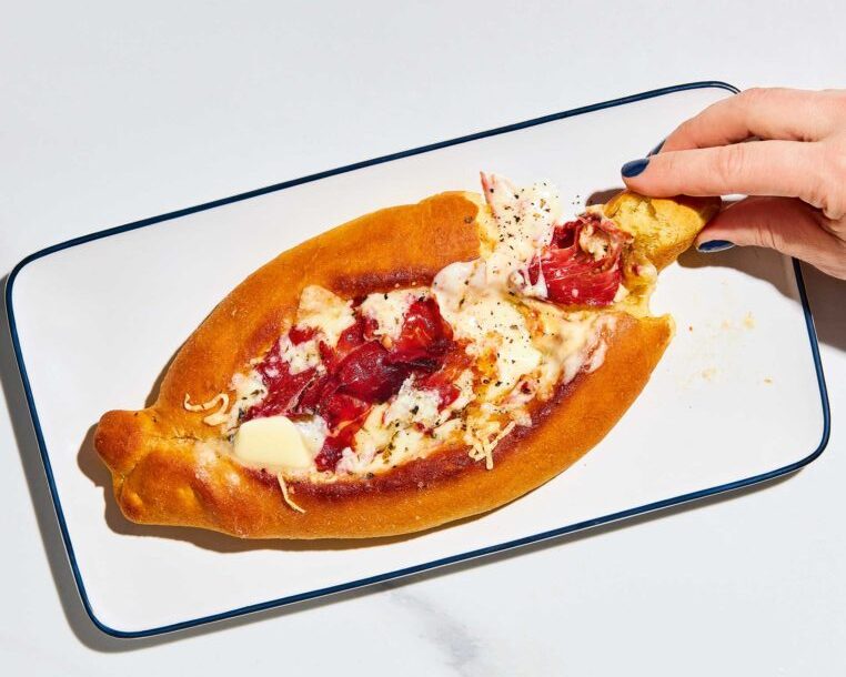 - Καλύπτουμε με το υπόλοιπο μείγμα κασεριού. Τέλος, μοιράζουμε από ένα κομμάτι βούτυρο σε κάθε πεϊνιρλί.