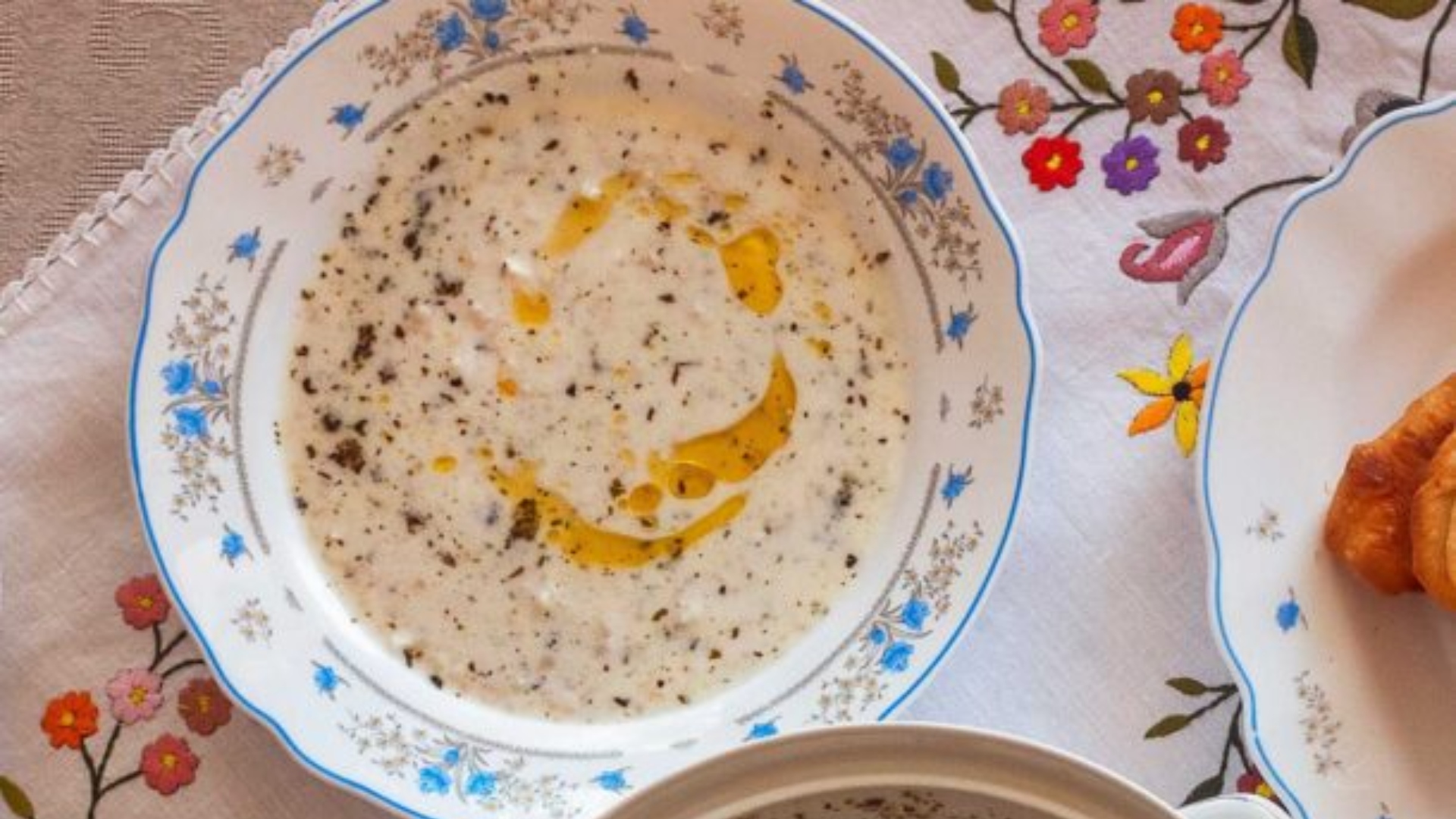 - Σε ένα μπολ ανακατεύουμε τον υπόλοιπο ζεστό ζωμό (ή νερό) με το πασκιτάν ή το γιαούρτι και το λάδι.