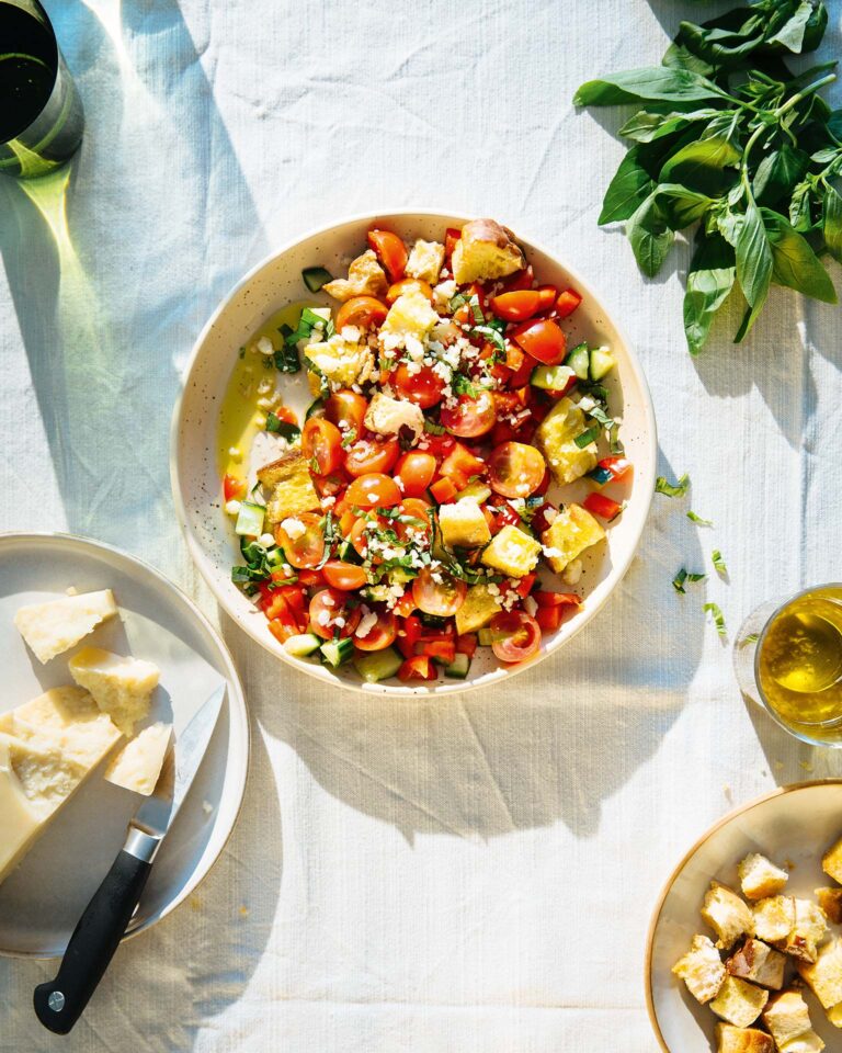 Η panzanella γεννήθηκε από την ανάγκη αξιοποίησης του μπαγιάτικου ψωμιού, που το μούσκευαν σε ξίδι και νερό και κατόπιν στα νόστιμα ζουμάκια των θερινών λαχανικών. Αν βάλουμε φρέσκο, θα το φρυγανίσουμε πρώτα, για να στεγνώσει και να απορροφήσει καλύτερα τις νοστιμιές των υλικών.