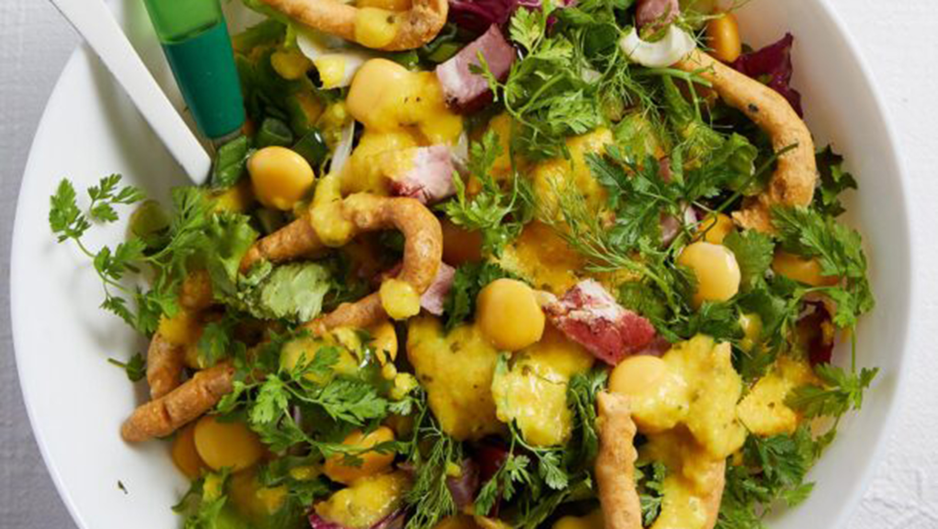 - Από πάνω αδειάζουμε το μείγμα της σαλάτας και γύρω της τα λαλάγγια.