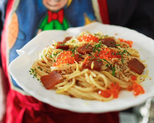 - Με πιρούνα μεταφέρουμε τα ζυμαρικά μέσα στο μείγμα ταραμά, αφήνοντας να παρασύρουν και λίγο από το νερό τους, και μαγειρεύουμε για 1 λεπτό, ανακατεύοντας συνεχώς για να αναμειχθούν τα υλικά και να δέσει η σάλτσα.