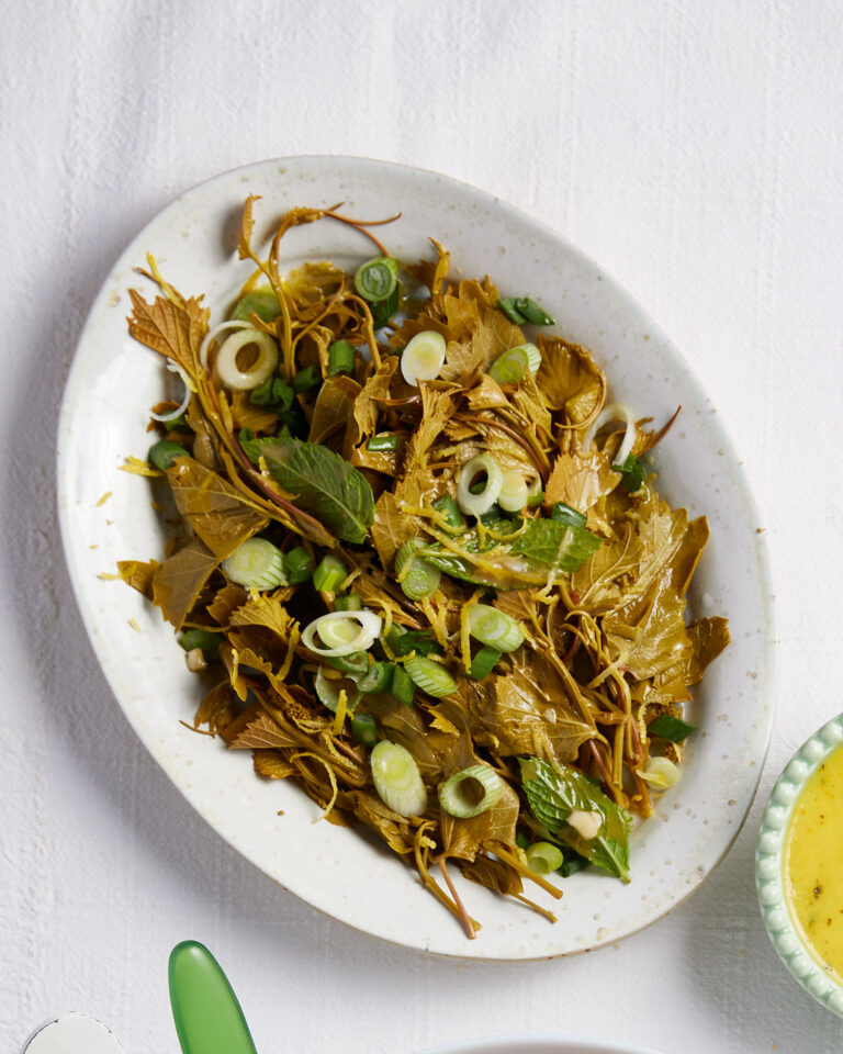 - Αδειάζουμε τα αμπελοβλάσταρα σε φαρδιά σαλατιέρα, προσθέτουμε το ντρέσινγκ και ανακατεύουμε καλά.