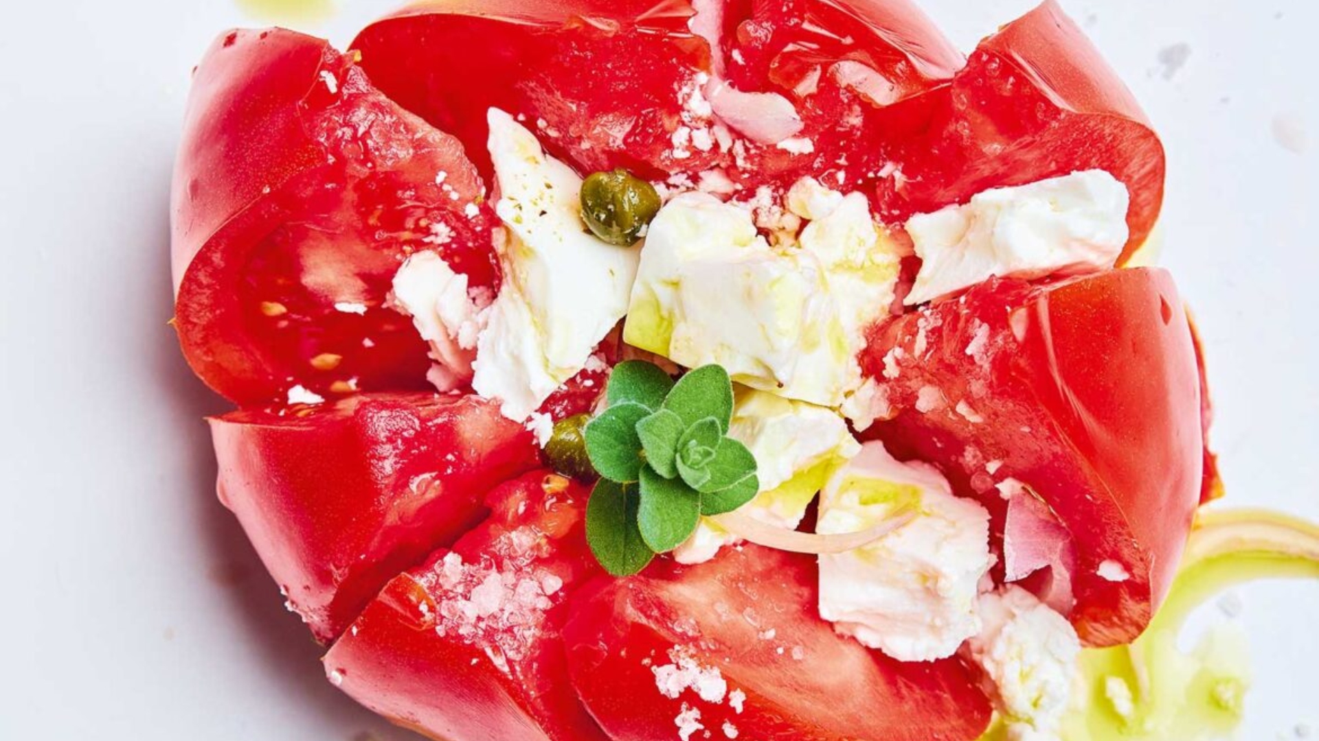 Ή καλό ψωμί ζυμωτό, από αυτά που κάνεις χιλιόμετρα για να τα βρεις (ιδίως εμείς εδώ στον Πειραιά). Φέτα ώριμη, πικάντικη (Καλαβρύτων, Άργους – της χήρας–, Κεφαλονιάς, ηπειρώτικη). Επίσης, χλωρά τυριά, ξινομυζήθρες κ.λπ. Ελιές (αλμάδες του Στατήρα διαχρονικά, δαμασκηνοελιές, ψιλελιές Κρήτης, ε, και φυσικά Καλαμών). Το μυρωδικό της: η βασίλισσα ρίγανη. Φρέσκια ή, προτιμότερη, ξερή βουνίσια (κορυφή του Ταϋγέτου), με χοντρό πράσινο φυλλαράκι, τριμμένη με τα μήλα των δαχτύλων πάνω από την ντομάτα. Αλλιώς, βασιλικός ελληνικός ψιλόφυλλος που μυρίζει ούζο (με τον πλατύφυλλο φτιάχνουμε άλλες σαλάτες), δυόσμος ή θυμάρι. Ντομάτα τριαντάφυλλο: μια παλιά ντοματοσαλάτα σαν κέντημα. Σε πιατάκι, χαραγμένη (όχι κομμένη) στα 8, με αυτά τα λίγα υλικά (τυρί, κάππαρη, κρεμμύδι) παραχωμένα στα ανοίγματα. Ελαιόλαδο και αλάτι. Με πιο πολλά υλικά έχουμε άλλες σαλάτες. Εκπλήξεις: αν βρείτε αυτό το πυκνό σκουροπράσινο (και πανάκριβο) λάδι από κελυφωτό φυστίκι, θα παραμιλάτε με τη νοστιμιά του παντρέματος με την ντομάτα (και τον χρωματικό συνδυασμό). Είχα πάρει κάποτε ένα μπουκάλι από τη θρυλική φυστικοπαραγωγό της Αίγινας, την Ελένη Κυπραίου. Άλλη έκπληξη: το μαυροκούκι. Αλάτι, λάδι, φρέσκο κρεμμυδάκι και λίγο μαυροκούκι που ανασύρει τη μνήμη του ψωμιού. Και άλλη: με αντζούγιες, σαρδέλα παστή, ψητές γαρίδες, ένα ψαρικό/ θαλασσινό ανά φέτα ντομάτας – μεζές. Και άλλη μία: με λεπτά φετάκια σκόρδο ανακατεμένα με φιλέ αμυγδάλου, χοντροτριμμένα ψίχουλα ροδισμένα στο τηγάνι και καυτερό κοκκινοπίπερο. Όταν ξεκινάνε τα μπάνια, την ντομάτα την τρώμε θεόσκετη, ολόκληρη, σαν φρούτο, πλυμένη στη θάλασσα, μόνο με τις αλμυρές σταγόνες που θα μείνουν πάνω της και το αλάτι που έχουν τα χείλη και τα δάχτυλά μας από τις βουτιές. Υπερβατική γλυκόξινη νοστιμιά που μεγεθύνει η ράθυμη διάθεση του θέρους. Σκέτη σκέτη είναι σκέτη απόλαυση.