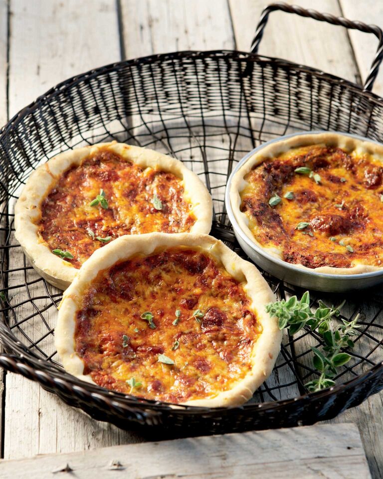 - Απλώνουμε σε κάθε δίσκο μια μικρή ποσότητα από τη σάλτσα που ετοιμάσαμε και καλύπτουμε με το κασέρι.