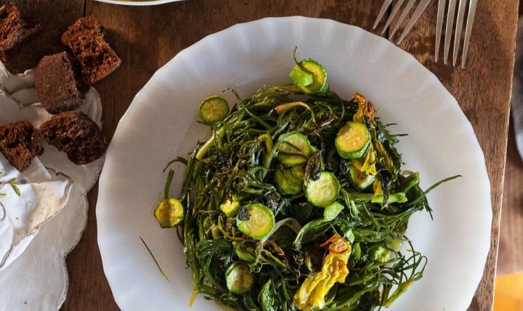 - Ρίχνουμε τα χόρτα και τους ανθούς και τα σοτάρουμε για μόλις μισό λεπτό, ανακατεύοντας συνεχώς, μέχρι να γυαλίσουν.