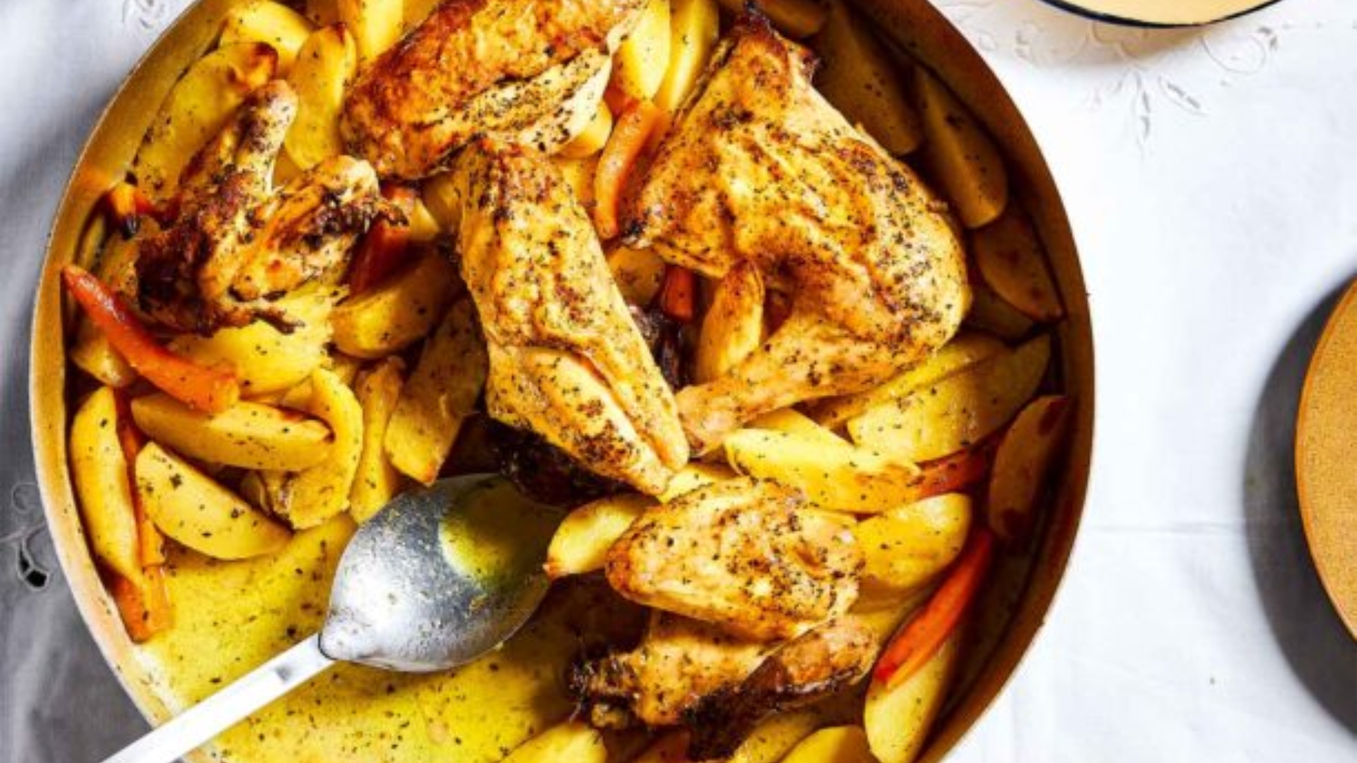 - Για να φτιάξουμε κοτόπουλο με πατάτες, καρότα και βερίκοκα, ξεκινάμε προθερμαίνοντας τον φούρνο στους 170°C και απλώνουμε τις πατάτες σε ένα μεγάλο ταψί. Τις αλατοπιπερώνουμε.