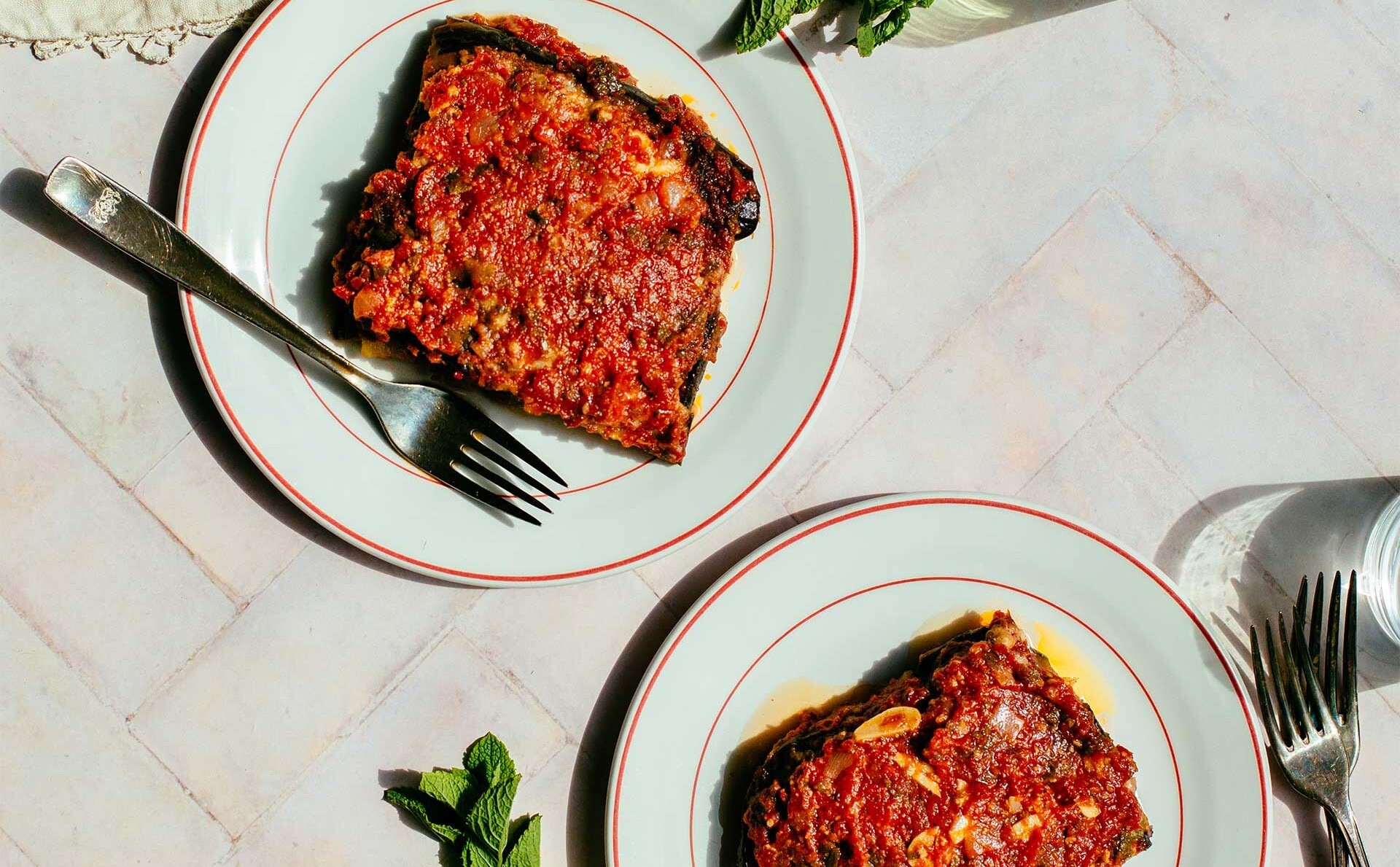 Ένας ιδιαίτερος, πρωτότυπος και απίθανα νόστιμος μουσακάς με ολόκληρα κομμάτια κοτόπουλου αντί για μοσχαρίσιο κιμά, ζουμερή σάλτσα ντομάτας και πικάντικο τυρί σε στρώσεις. Τον συνοδεύουμε με μια πλούσια και δροσερή ντοματοσαλάτα με δυόσμο και ελιές Καλαμών και αφράτα σταρένια παξιμάδια.