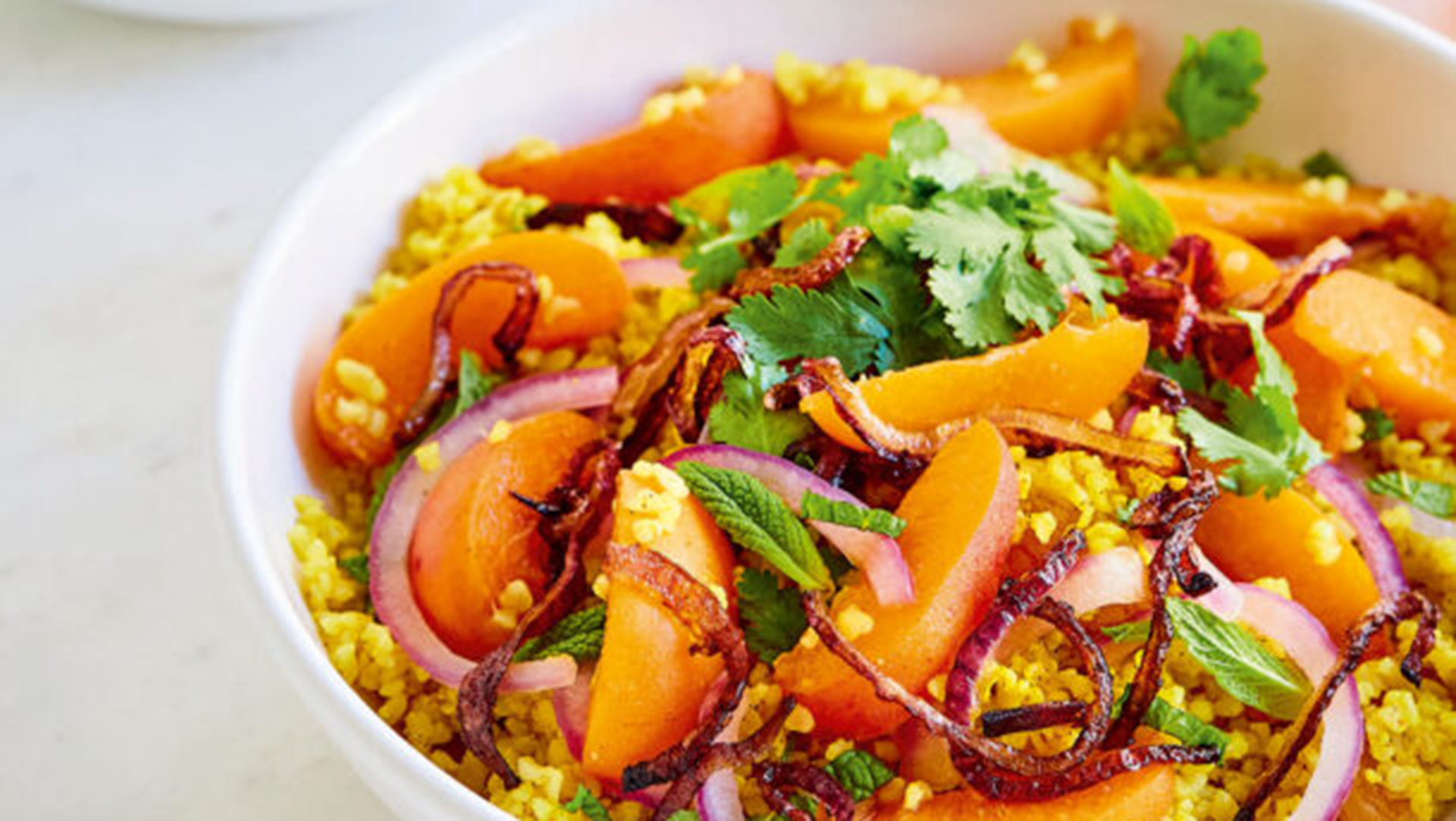 - Ανακατεύουμε και σερβίρουμε τη σαλάτα με κουσκούς, βερίκοκα με το τηγανισμένο, τραγανό κρεμμύδι.