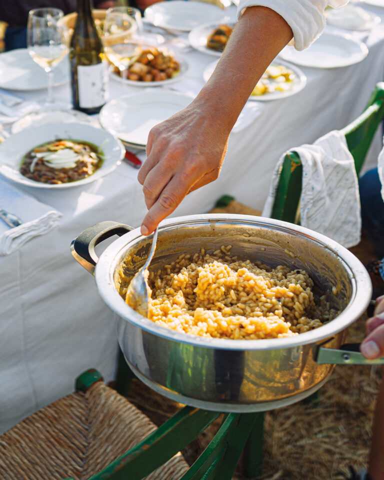 - Ρίχνουμε σταδιακά τον ζωμό που είχαμε κρατήσει στην άκρη και μαγειρεύουμε για περίπου 15 λεπτά, μέχρι να απορροφηθεί από το ρύζι.