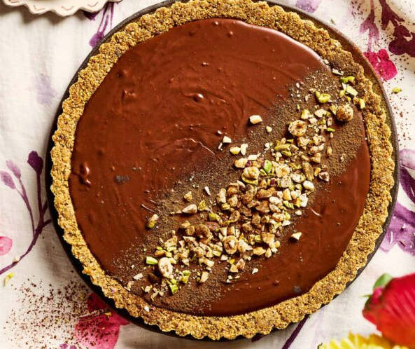 - Πασπαλίζουμε με τους ξηρούς καρπούς και σερβίρουμε την τάρτα με βάση από ξηρούς καρπούς.