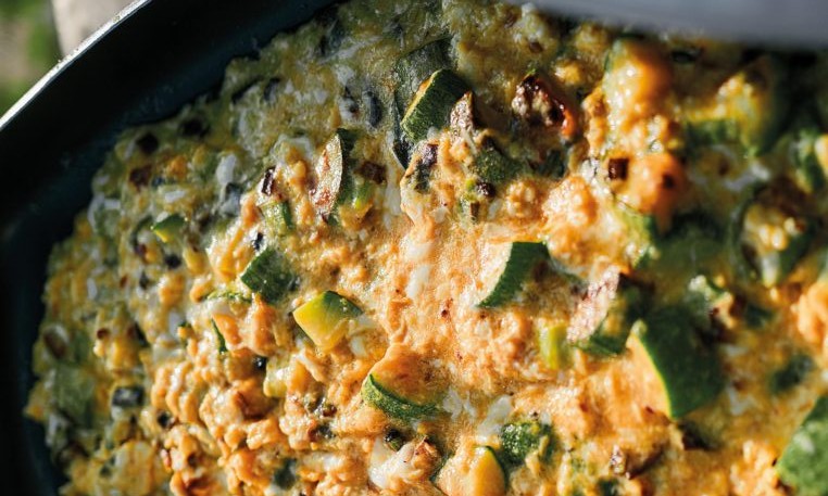 - Ξεσκεπάζουμε, προσθέτουμε τη στάκα, τα χτυπημένα αυγά και αλατοπίπερο και ανακατεύουμε απαλά μέχρι να αναμειχθούν τα υλικά και να πήξει το μείγμα των αυγών, όπως στη στραπατσάδα.
