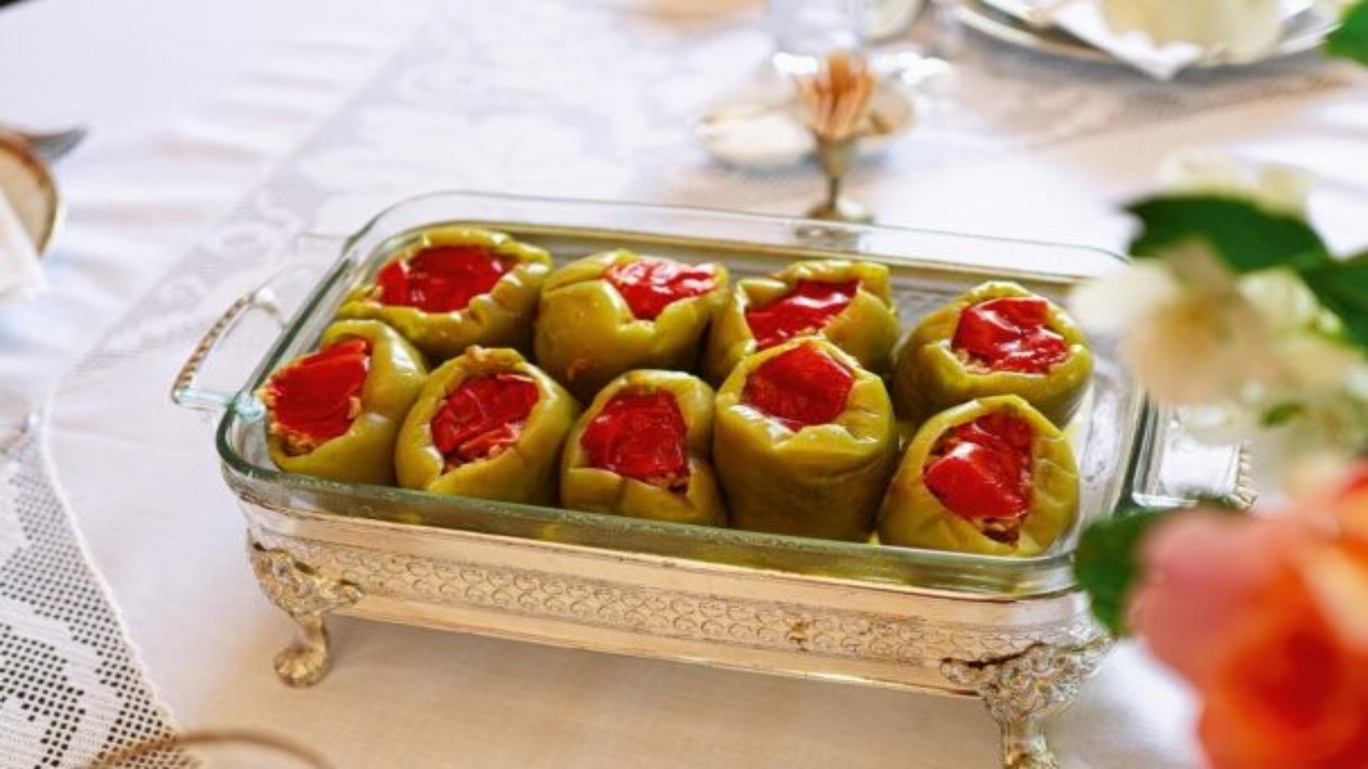 - Τακτοποιούμε τις πιπεριές όρθιες, με το άνοιγμα προς τα πάνω δηλαδή, κολλητά τη μία στην άλλη.