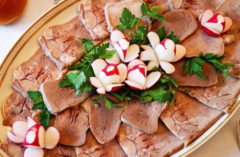 - Κόβουμε τη γλώσσα σε λεπτές φέτες και τις τακτοποιούμε όμορφα σε μια πιατέλα. Ραντίζουμε με το ελαιόλαδο και τον χυμό λεμονιού, αλατοπιπερώνουμε και σερβίρουμε.