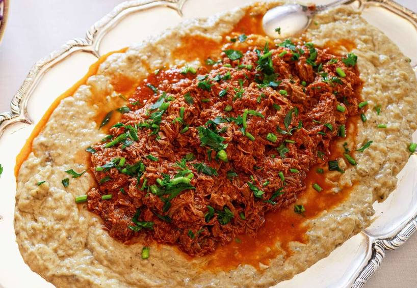 - Απλώνουμε τον πουρέ μελιτζάνας σε μια μεγάλη πιατέλα.