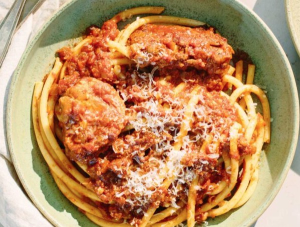 - Συνοδεύεται, παραδοσιακά, με χοντρά μακαρόνια για παστίτσιο, με τρύπα δηλαδή, που αφήνει τη σάλτσα να εισχωρήσει στο μακαρόνι και να το νοστιμίσει. Παλιότερα μάλιστα στην Κέρκυρα λειτουργούσαν βιοτεχνίες ζυμαρικών, που έφτιαχναν και ζυμαρικά ειδικά για το παστιτσάδο, μακριά, αλλά πολύ πιο χοντρά! Εμείς μπορούμε να το συνδυάσουμε και με ζυμαρικά άλλων τόπων (βλ. ματσάτα).