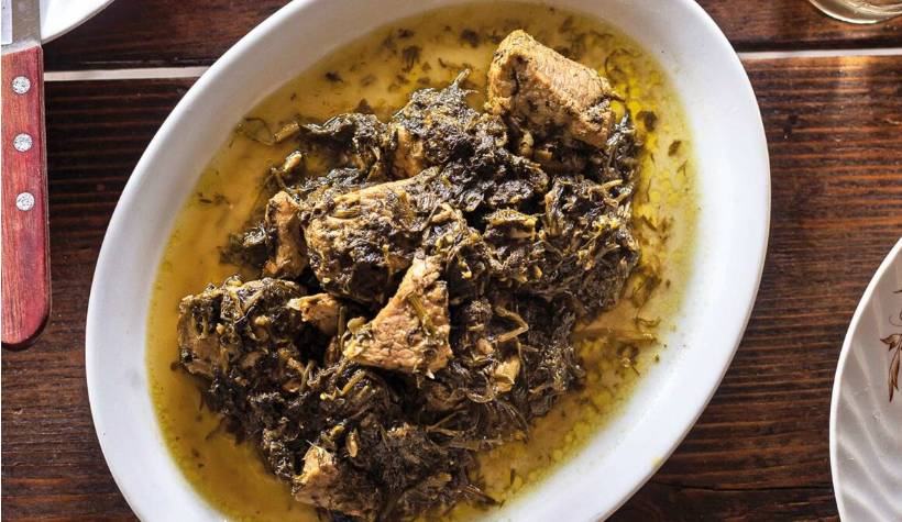 Προτιμάμε το μπούτι, ένα μέρος του χοιρινού χωρίς λίπος δηλαδή, γιατί το λίπος στο μαγείρεμα κομματιάζεται και μπερδεύεται με τα χόρτα μέσα στην κατσαρόλα, αφήνοντας στο στόμα μια κάπως δυσάρεστη αίσθηση. Τη λιπαρότητα και τη νοστιμιά εδώ τη δίνει το ελαιόλαδο, που μπαίνει σε γενναία ποσότητα. Τα χόρτα είναι τα ανοιξιάτικα της εξοχής, που βγαίνουν όλα μαζί και η Ελένη που μας έδωσε τη συνταγή, τα μαζεύει, τα πλένει, τα καθαρίζει και τα ψιλοκόβει. Έπειτα, τα πακετάρει σε δόσεις και τα διατηρεί στην κατάψυξη όλο τον χρόνο: μάραθος, κουρνοπόδοι (ή γουρνοπόδοι), λαγουδόχορτο, λαγουδοπάτουχα, αχατζίκοι (μυρώνια), λάπαθο, λίγοι σταφιλινάκοι, παπαρουνόφυλλα, καυκαλήθρες. Είναι φαγητό καθαρά ανοιξιάτικο ‒ τέτοια εποχή δεν θα βρούμε τα χόρτα, αλλά την άνοιξη θα τα αναζητήσουμε στη λαϊκή ως μείγμα από άγρια χόρτα για πίτες.