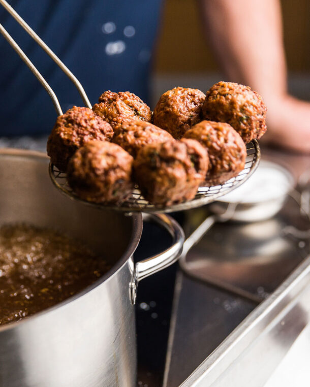 - Η ιδανική επιλογή για τηγάνισμα είναι το εξαιρετικό παρθένο ελαιόλαδο, που, ως μονοακόρεστο λιπαρό, είναι αρκετά ανθεκτικό σε λογικές θερμοκρασίες. Υπολογίζουμε το λάδι να φτάνει περίπου στα 3 εκ. από τον πάτο του τηγανιού – η ποσότητα πρέπει να είναι τόση ώστε να καλύπτει τους κεφτέδες κατά το ήμισυ. Αν βάλουμε περισσότερο λάδι, το τηγάνι κινδυνεύει να ξεχειλίσει μόλις βάλουμε τους κεφτέδες.