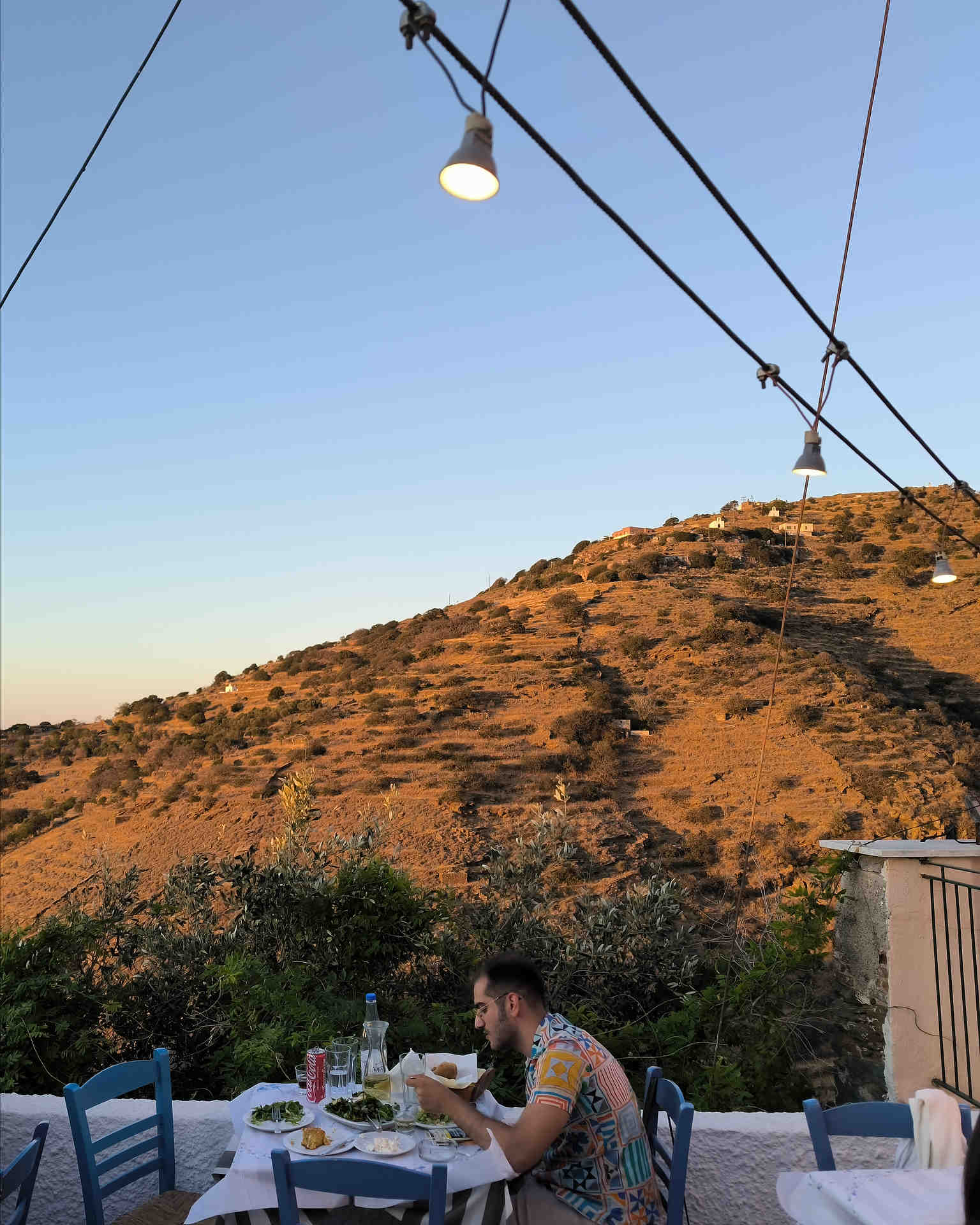 Το επόμενο βράδυ, το τραπέζι στο Στέκι μας περιμένει. Ακριανό, για δύο άτομα. Μπροστά το ηλιοβασίλεμα και πίσω η εκκλησία, με την καμπάνα να είναι προγραμματισμένη να χτυπάει κάθε ώρα. Το χάρτινο τραπεζομάντιλο με τον χάρτη της Κέας έχει ήδη απλωθεί στο τραπέζι. Η γυναίκα μάς καλωσορίζει με χαμόγελο, αφήνει το μενού, μαζί με το ψωμί και τα ποτήρια. Εδώ και είκοσι χρόνια που λειτουργεί, φτιάχνουν μαγειρευτά που είναι σαν να τρως απ’ την κουζίνα της μάνας σου. Οι τιμές είναι προσιτές. «Εξαιρετικά τίμιο», σχολιάζουμε με τον φίλο μου.