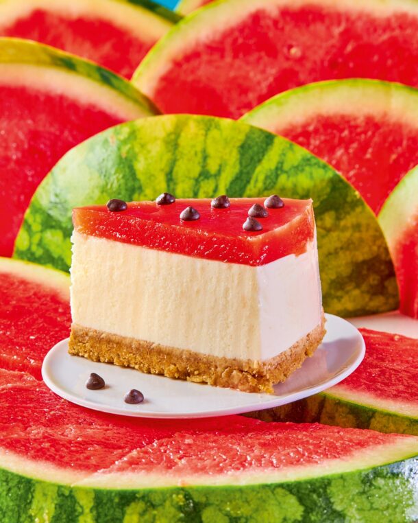 Κλασικό γλυκό, αλλά με ασυνήθιστη εμφάνιση, αφού την τυπική επικάλυψη από φρούτα του δάσους παίρνει εδώ ένα ζελέ από καρπούζι, με χαριτωμένη ιδέα τις σταγόνες σοκολάτας που θα μοιάζουν με τα κουκούτσια του.