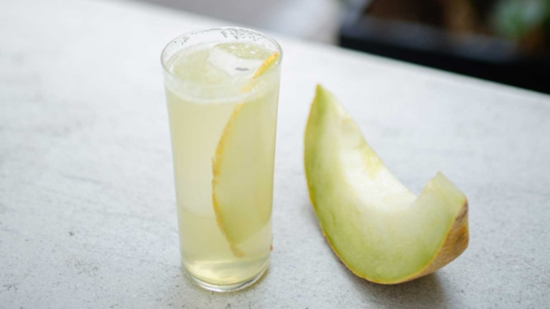 - Πολτοποιούμε δύο φέτες πεπόνι, σουρώνουμε τον χυμό για να αφαιρέσουμε τις ίνες και τον ρίχνουμε στο ποτήρι.