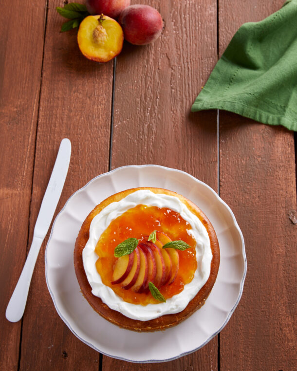 - Απλώνουμε σε λεπτή στρώση το γιαούρτι πάνω στην επιφάνεια του τσίζκεϊκ και έπειτα απλώνουμε τη μαρμελάδα ροδάκινο.