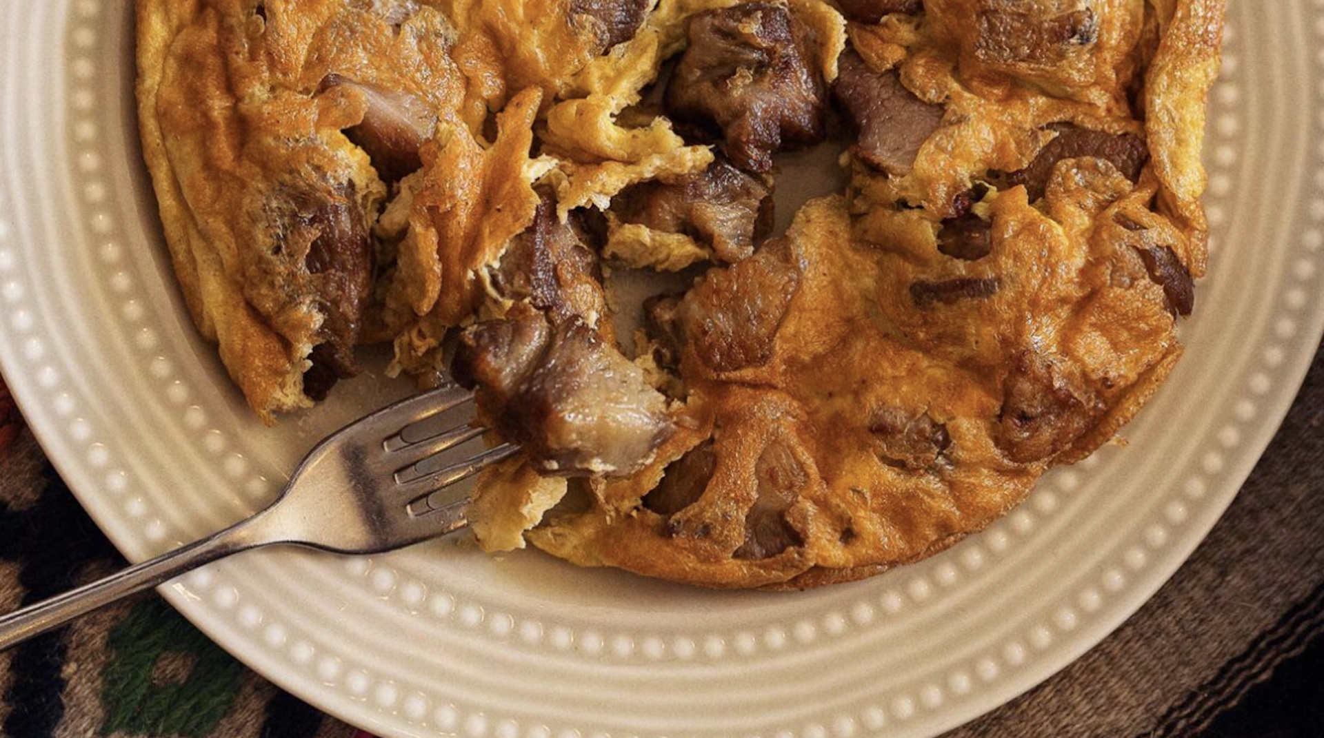 Αυγά και ξιδάτο χοιρινό, όπως το κάνουν στ’ Ανώγεια και στα χωριά γύρω απ’ το Ρέθυμνο: ζεστά, χορταστικά, με γεύση που σου μένει.