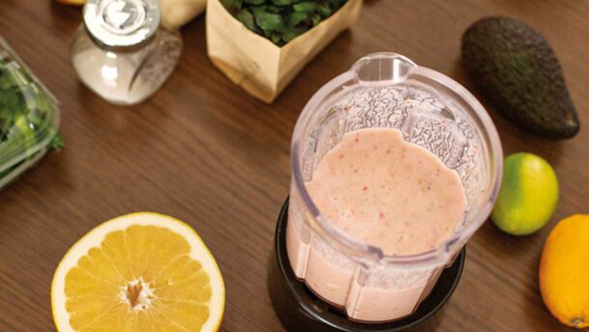 - Βάζουμε τα φρούτα και τα υπόλοιπα υλικά της συνταγής μέσα στην κανάτα του μπλέντερ και ομογενοποιούμε.