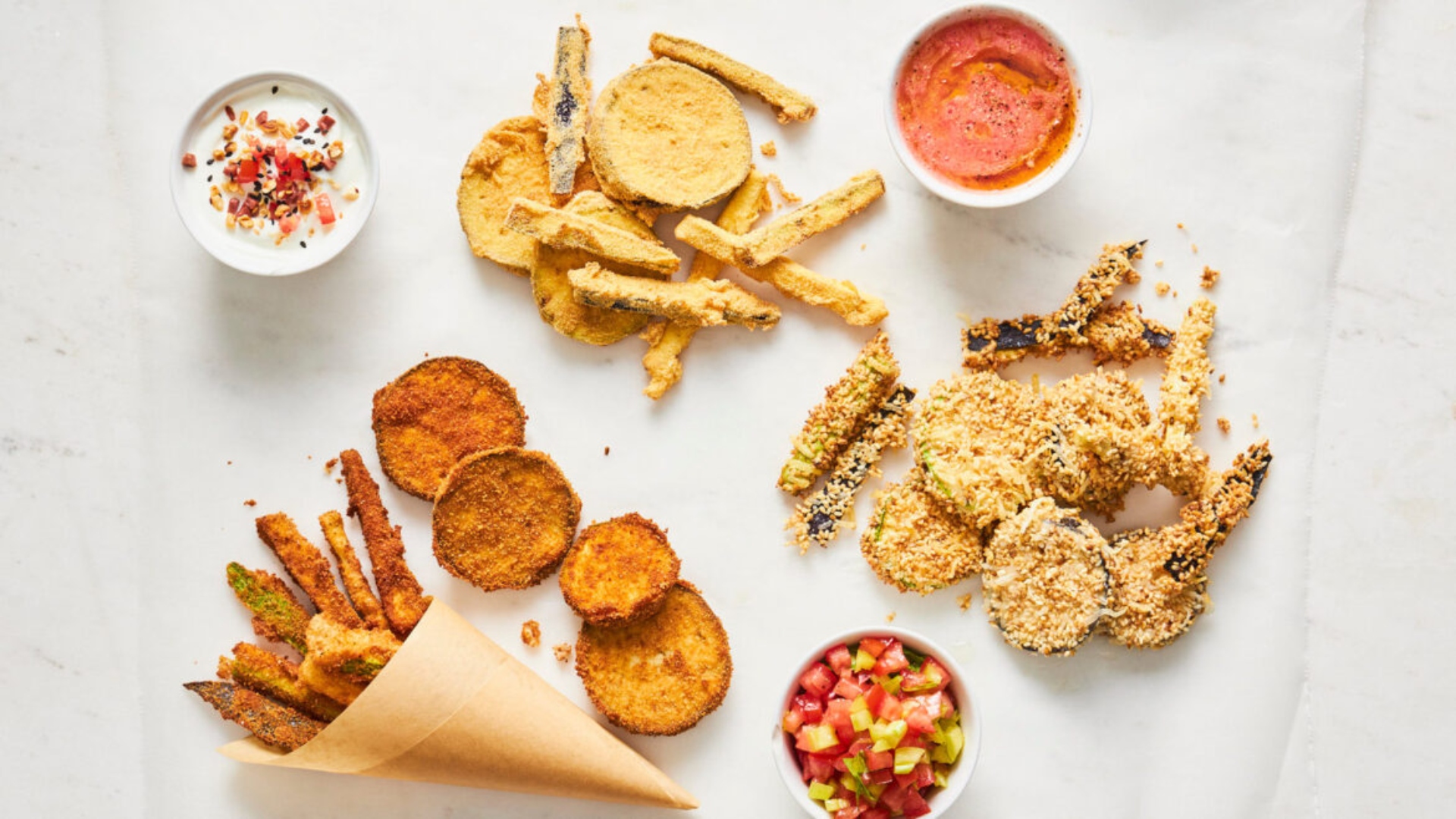 Βάζουμε το λάδι να κάψει. Γεμίζουμε ένα μπολ με κρύο νερό και δίπλα βάζουμε ένα πιάτο με αλεύρι. Μόλις κάψει το λάδι, με γρήγορες κινήσεις παίρνουμε ένα ένα τα λαχανικά και τα βουτάμε πρώτα στο νερό και μετά στο αλεύρι, τα γυρνάμε και από τις δύο πλευρές να καλυφθούν καλά και τα τινάζουμε ελαφρώς να πέσει το περιττό αλεύρι. Τα βουτάμε ξανά στιγμιαία μέσα στο μπολ με το νερό και τα ρίχνουμε στο καυτό λάδι. Θα πιτσιλίσει λίγο στην αρχή, γι’ αυτό προσοχή!