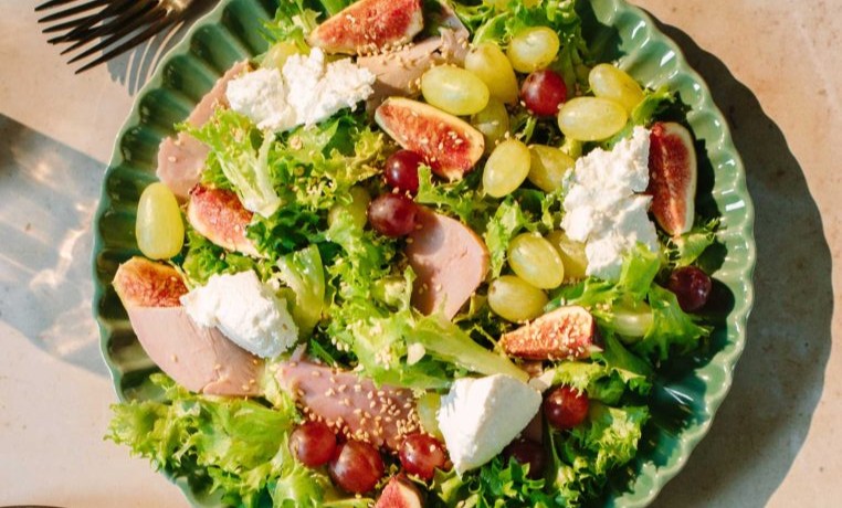 - Για να ετοιμάσουμε την πλούσια σαλάτα με σύκα και σταφύλι σε ένα βαθύ μπολ ή σε μια πιατέλα ανακατεύουμε τη σαλάτα με το σταφύλι και τα σύκα.