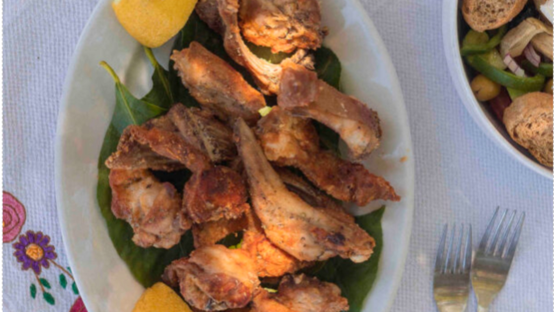 Τον συναντήσαμε στην κουζίνα της ταβέρνας, πάνω από το τηγάνι όπου ζέσταινε το λάδι. Είχε κόψει ο ίδιος το κρέας σε λεπτές φέτες σαν παϊδάκια – βασικό στάδιο της συνταγής, καθώς τα κομμάτια πρέπει να έχουν ομοιόμορφο πάχος για να τηγανιστούν όλα στον ίδιο χρόνο. Η κοπή δεν είναι εύκολη υπόθεση και ο χασάπης θα πρέπει να είναι έμπειρος, ώστε να μη λιανίσει τα λεπτά κόκαλα του ζώου, γιατί το τρίμμα τους θα χωθεί στο ψαχνό. Ο Νεκτάριος τα είχε κόψει με χειρουργική ακρίβεια και τέχνη, σε κομμάτια όχι μεγαλύτερα από οκτώ, το πολύ 10 πόντους. Τα παϊδάκια αλευρώνονται, μπαίνουν στο τηγάνι με το καυτό λάδι και, αμέσως μόλις βγουν, τους ρίχνουν λίγη ξερή ρίγανη και χυμό λεμονιού. «Το κουνέλι θέλει δυνατό τηγάνισμα», συμβουλεύει ο Νεκτάριος, που έχει ανάψει την γκαζιέρα και περιμένει να ζεσταθεί το λάδι. «Τα κομμάτια όμως τα ρίχνεις στο λάδι προτού κάψει καλά και, μόλις τα βάλεις, τότε φουλάρεις τη φωτιά. Παλιά η φωτιά ήταν από λιανά κλαριά ελιάς και το κουνέλι έβγαινε πιο νόστιμο, πιο τραγανιστό», συμπληρώνει. Το λάδι είναι συνήθως ελαιόλαδο, αλλά ελαφρύ. Συχνά το τηγανίζουν και σε σπορέλαιο γιατί ροδίζει καλύτερα τα κομμάτια. «Το ελαιόλαδο είναι καλύτερα να το τρως ωμό», λένε εδώ.