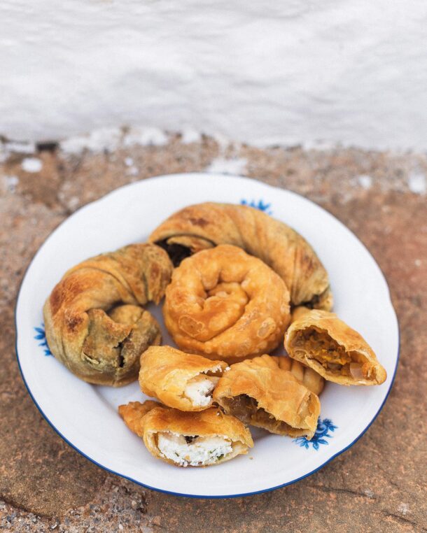 Στο ποτήρι μας: Οι κρητικές πίτες με τη φινέτσα του φύλλου και τις γεύσεις που ακροβατούν ανάμεσα στο γλυκό και το αλμυρό ταιριάζουν περίφημα με τα ξηρά τοπικά κρασιά από αρωματικές ποικιλίες, Μαλβαζία, Μοσχάτο Σπίνας.