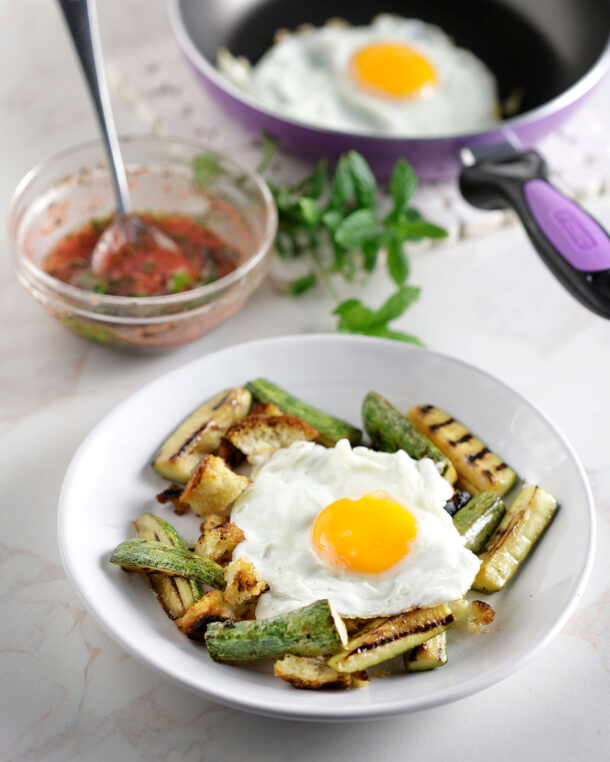 Με δυο υλικά και δυο μυρωδικά μπορείς να κάνεις ωραία πράγματα. Συνοδεύουμε τα αυγά με τα κολοκυθάκια με λίγο ψωμί της αρεσκείας μας και με μια απλή ντοματοσαλάτα.