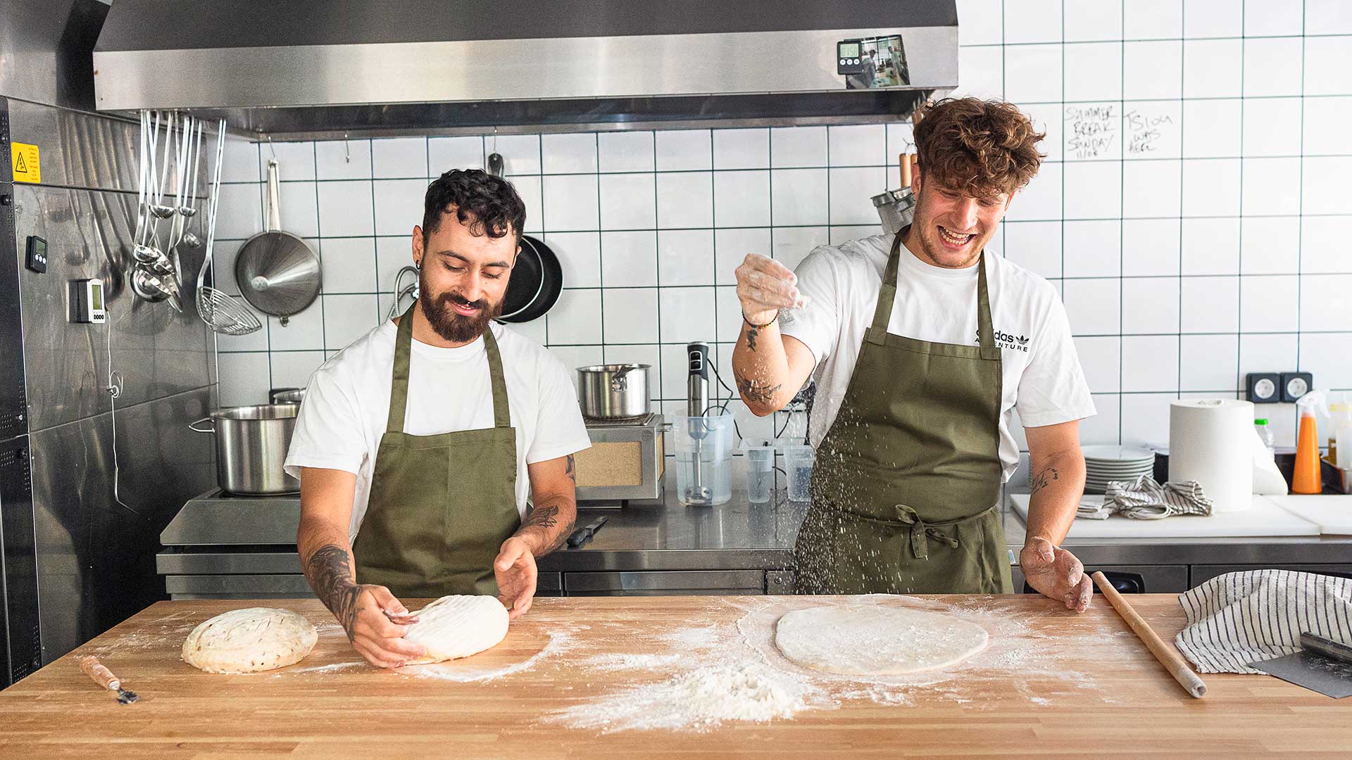 Δίπλα στις πίτες, βρίσκουμε το ψωμί. Σταρένιο και πολύσπορο, φτιαγμένο με προζύμι 16 χρόνων που ωριμάζει για 24 ώρες. «Το προζυμένιο ψωμί δεν το αφήνεις απλώς να γίνει, έχει στάδια. Είναι σαν να μεγαλώνεις ένα παιδί», λέει ο Θεοδόσης, ο αρτοποιός της ομάδας, που έχει δουλέψει σε φούρνους στην Ολλανδία και στην Ελλάδα. Εκτός από τα καρβέλια, φτιάχνει τσιαμπάτες που γίνονται σάντουιτς, ενώ τα Σάββατα ετοιμάζει και πίτσες.