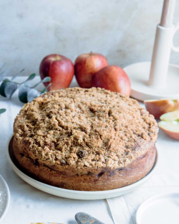 - Στρώνουμε πάνω του το τραγανό μείγμα της επικάλυψης και ψήνουμε το κέικ για 55-60 λεπτά. Αν η επικάλυψη ροδίσει έντονα από την αρχή, καλύπτουμε το σκεύος χαλαρά με ένα κομμάτι αλουμινόχαρτο, το οποίο αφαιρούμε 5 λεπτά πριν ολοκληρωθεί το ψήσιμο.