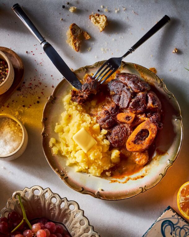 - Ξεφουρνίζουμε, ξεσκεπάζουμε το σκεύος και μεταφέρουμε τις φέτες οσομπούκο σε μια πιατέλα.