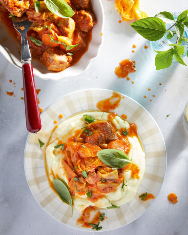 Ονειρεμένο κοκκινιστό του θέρους με μοσχάρι και κολοκυθοανθούς. Για συνοδευτικό του θέλει τηγανητές πατάτες ή έναν αφράτο πατατοπουρέ.