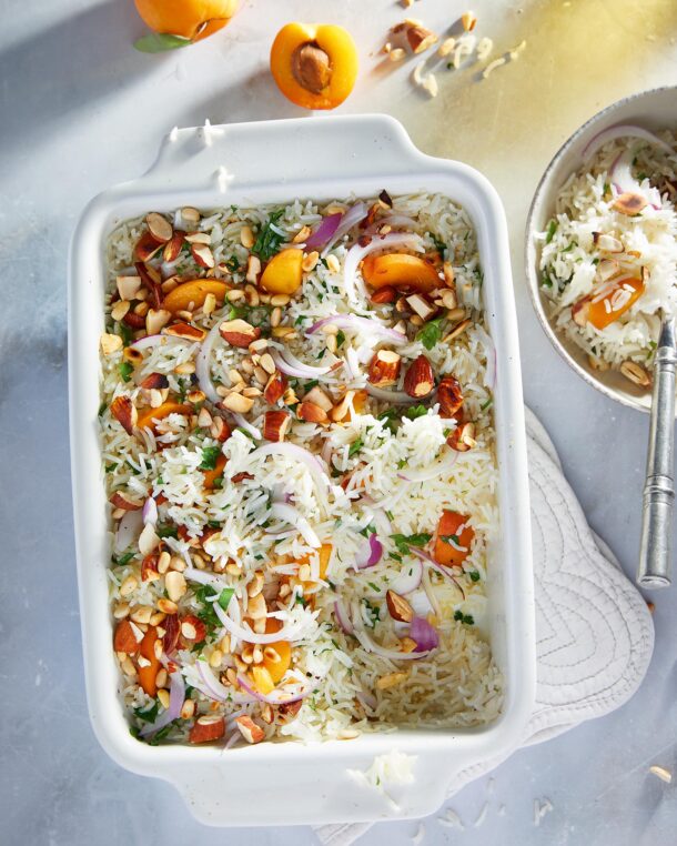 - Για να φτιάξουμε ρυζοσαλάτα με βερίκοκα και ξηρούς καρπούς, αρχικά προθερμαίνουμε τον φούρνο στους 230°C.
