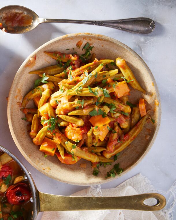 Ενα λαδερό διαφορετικό από τα συνηθισμένα: μπάμιες μαγειρεμένες με γλυκοπατάτες, οι οποίες δίνουν στο φαγητό γλυκιά και πλούσια γεύση.